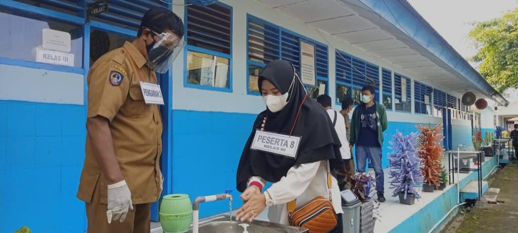 Dalam simulasi itu, peserta didik dan pengajar diwajibkan memakai masker. Mereka juga wajib di screening sebelum masuk ke sekolah serta mencuci tangan sebelum memulai aktivitas proses belajar mengajar.