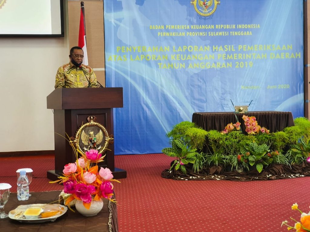 Bupati Buton Tengah Samahuddin, memberikan sambutan usai menerima predikat WTP di Kantor BPK RI Perwakilan Sultra, Kendari, Senin (23/06/2020).