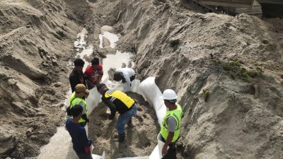 “Selebihnya kami timbun lagi dengan pasir kebelakang biar lebih tebal untuk penanganan sementara, insyaAllah Kalau cuaca bgus tidak hujan kita estimasi pengerjaan rampung satu Minggu” imbuhnya.