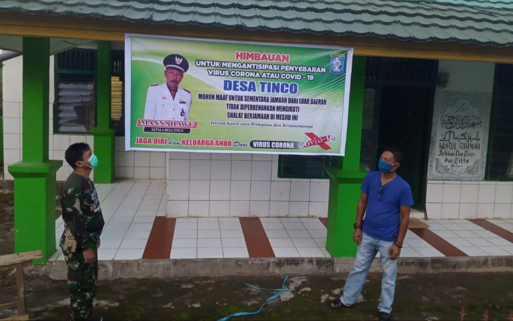 Berikut isi imbauan Pemerintah Kecamatan yang dipasang Pemdes Tinco yaitu, dalam rangka penyebaran Virus Corona (Covid-19) di Desa Tinco, memohon maaf untuk sementara Jamaah dari Daerah lain tidak diperkenankan mengikuti Salat berjamaah di Mesjid ini dan Salat Tarwih agar dilakukan di rumah saja. (Yusuf)