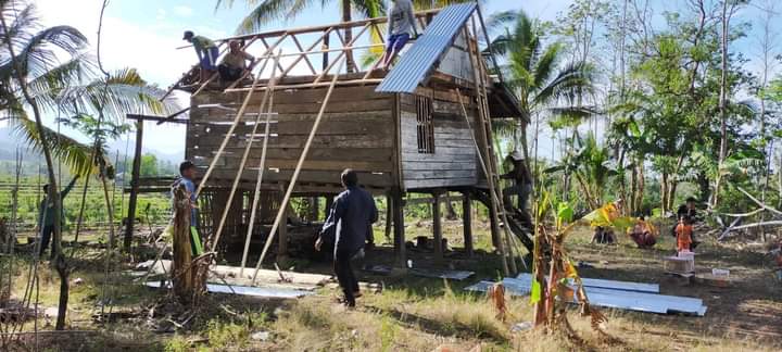 Turut hadir dalam bedah rumah ini Kapospol Bakungnge Aipda A. Tawakkal bersama masyarakat setempat bergotong royong dalam perbaikan rumah nenek Sitti. (Abdul Muhaimin)