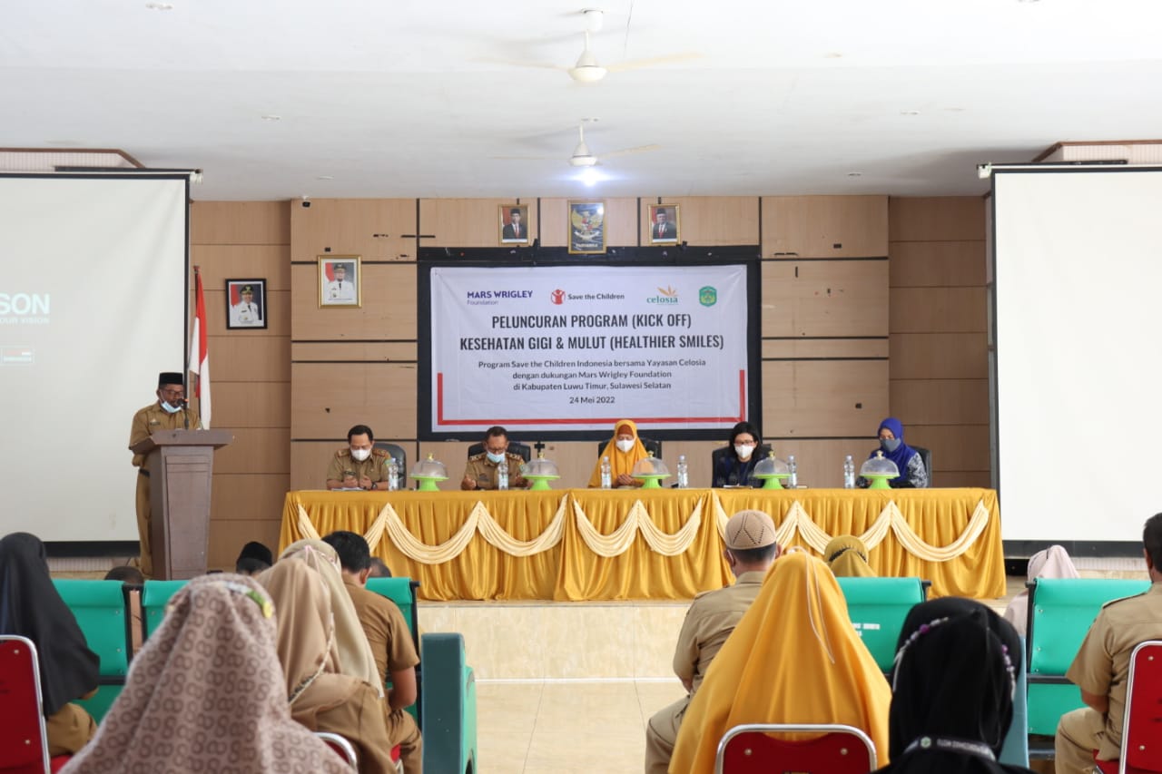 REPUBLIKNEWS.CO.ID, LUWU TIMUR- Asisten Administrasi Umum Kabupaten Luwu Timur (Lutim), Nursih Hariani mewakili Bupati Lutim, didampingi oleh Sekretaris Dinas Pendidikan dan Kebudayaan, H. Basruddin, Sekretaris Dinas Kesehatan, Andi Tulleng, PT. Mars Symbioscience Indonesia, Andi Fitriani serta Senior Program Manager Yayasan Save The Children Indonesia, Aduma Sitomorang, melakukan peluncuran program kesehatan gigi dan mulut (Healthier Smiler), di Aula Disdikbud, Selasa (24/05/2022).