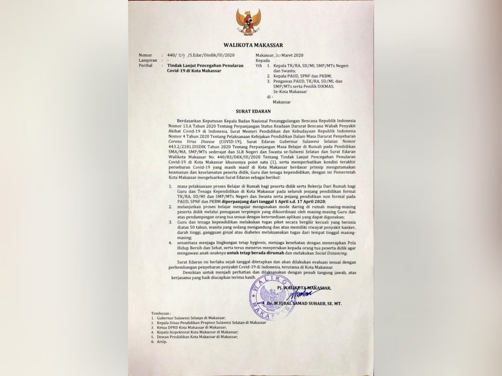 Penjelasan mengenai perpanjangan belajar jarak jauh di Makassar itu tertuang dalam SE yang ditandatangani Iqbal tertanggal 30 Maret 2020 dengan Nomor 440/129/S.Edar/Disdik/III/2020 mengenai Tindak Lanjut pencegahan Penularan Covid-19 di Kota Makassar.