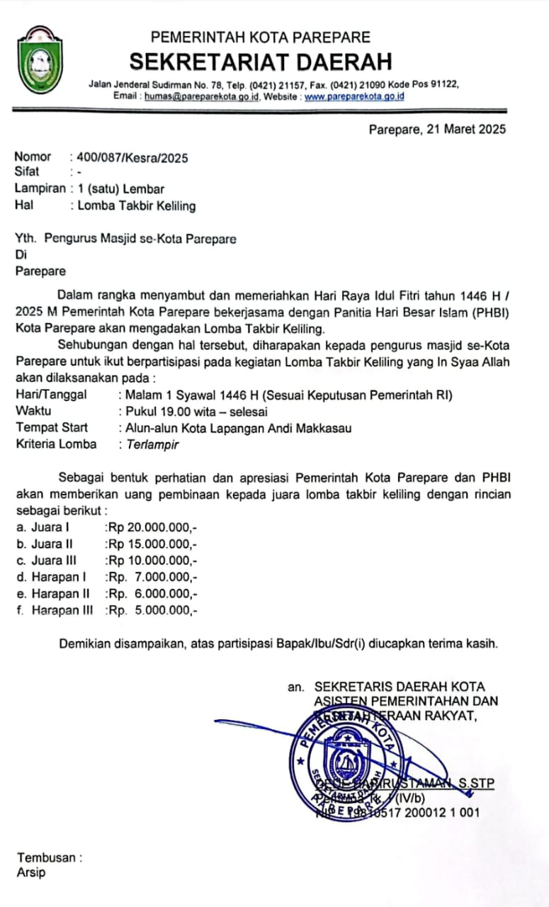 Lomba Takbir Keliling ini tertuang dalam surat edaran Sekretaris Pemkot Parepare Nomor: 400/087/Kesra/2025 yang diterbitkan pada 21 Maret 2025. Dalam surat tersebut, Pemkot Parepare bekerja sama dengan Panitia Hari Besar Islam (PHBI) Parepare mengajak seluruh pengurus masjid untuk ikut serta dalam perlombaan yang akan digelar pada malam 1 Syawal 1446 H, sesuai dengan keputusan pemerintah.
