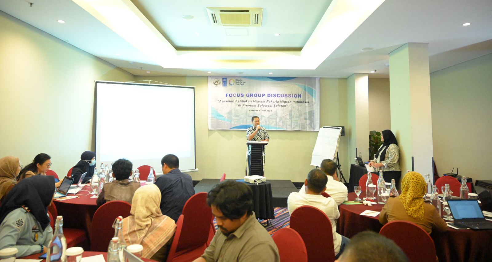 Turut hadir Heri Supriyatno selaku Kasubdit Ketenagakerjaan dan Transmigrasi Direktorat SUPD 4 Kemendagri, Wisnu Hartawan selaku penyusun bahan kebijakan Kementerian Dalam Negeri, Clarissa Tanurahardja selaku Technical Officer UNDP Indonesia dan Hariyanto selaku Ketua Umum SBMI.