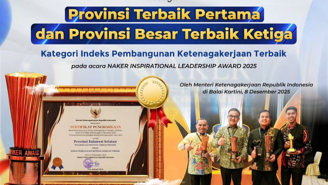 “Alhamdulillah, Pemerintah Provinsi Sulawesi Selatan meraih penghargaan sebagai Provinsi Terbaik Pertama dan Provinsi Besar Terbaik Ketiga untuk Kategori Indeks Pembangunan Ketenagakerjaan Terbaik pada kegiatan Naker Inspirational Leadership Award 2025,” ujarnya.