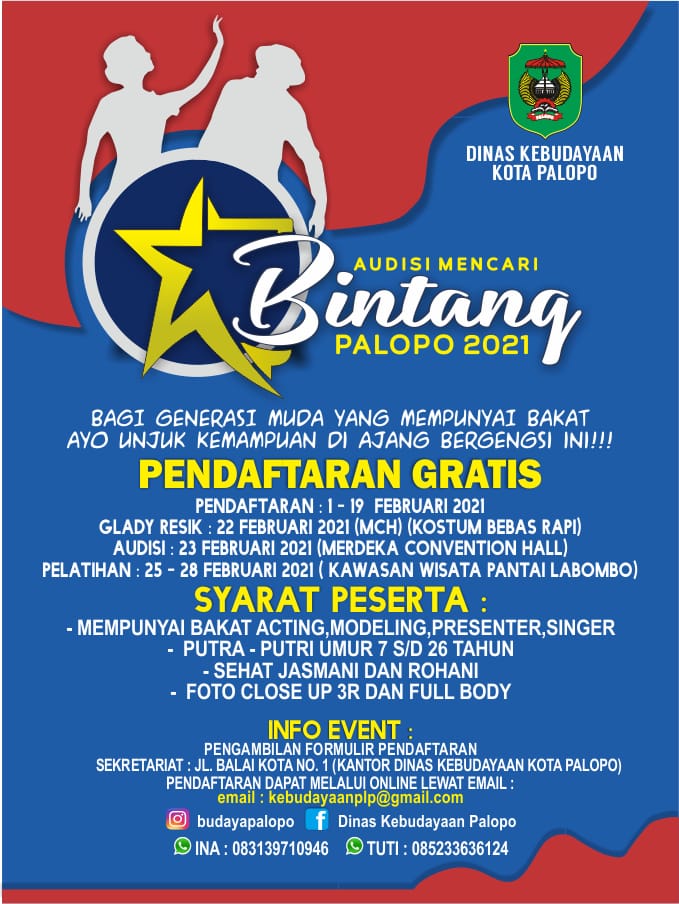 Dinas Kebudayaan Kota Palopo menggelar audisi mencari bintang terbagi dalam bidang akting, modeling, singing dan presenter.