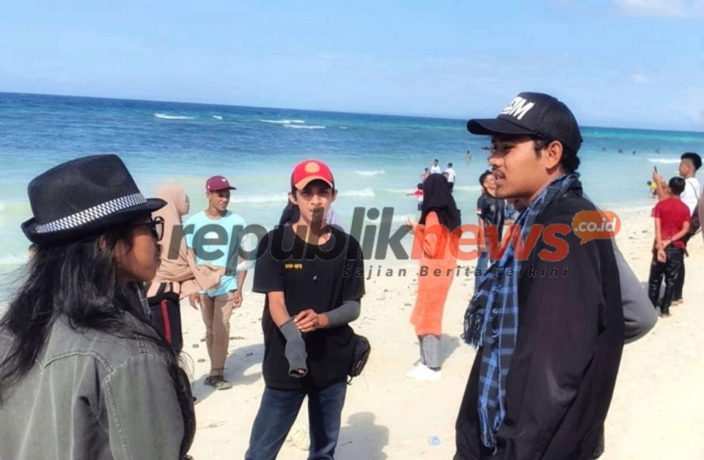 Salah satu pengunjung Pantai Mutiara, Sugiman (memakai kacamata), berbincang dengan Jurnalis Republiknews.co.id, di Pantai Mutiara, Minggu (02/08/2020).