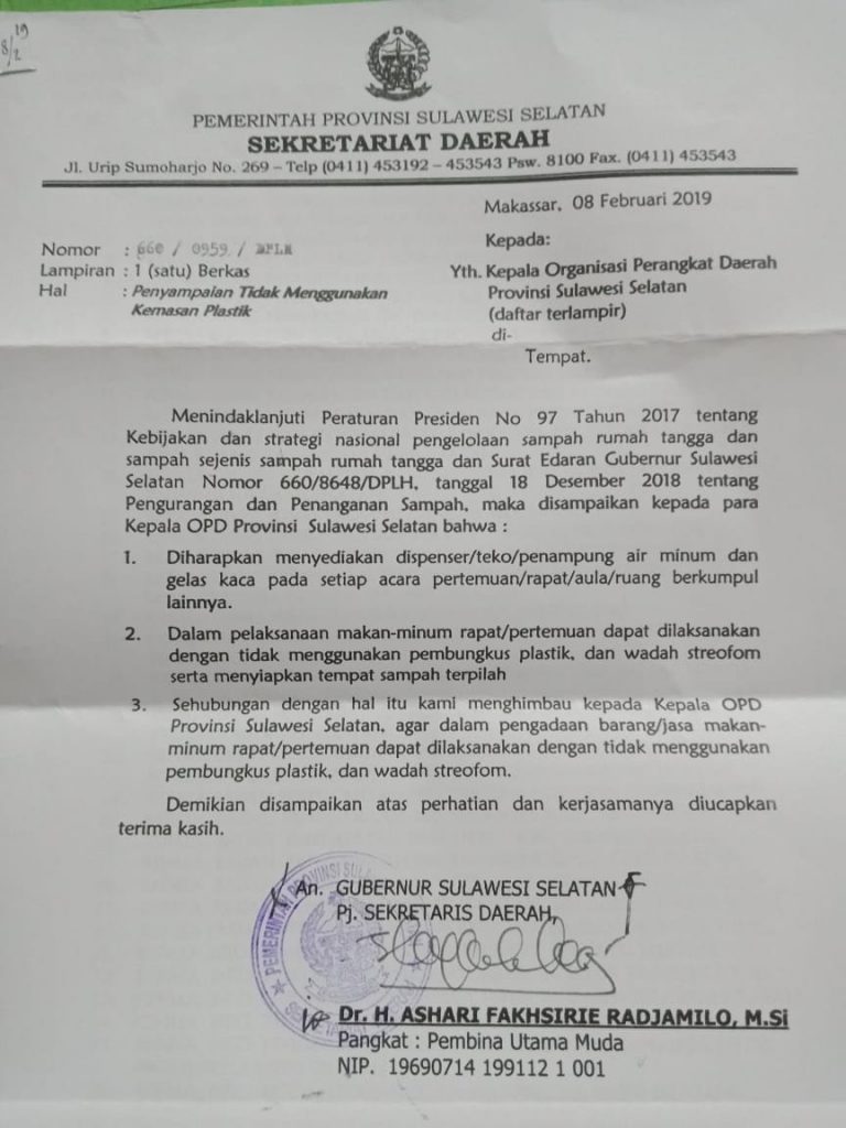 Dalam surat tersebut disampaikan kepada para Kepala OPD di lingkup Pemprov Sulsel, diharapkan disediakan dispenser/teko penampung air minum dan gelas kaca pada setiap acara pertemuan/rapat/aula/ruang berkumpul lainnya.