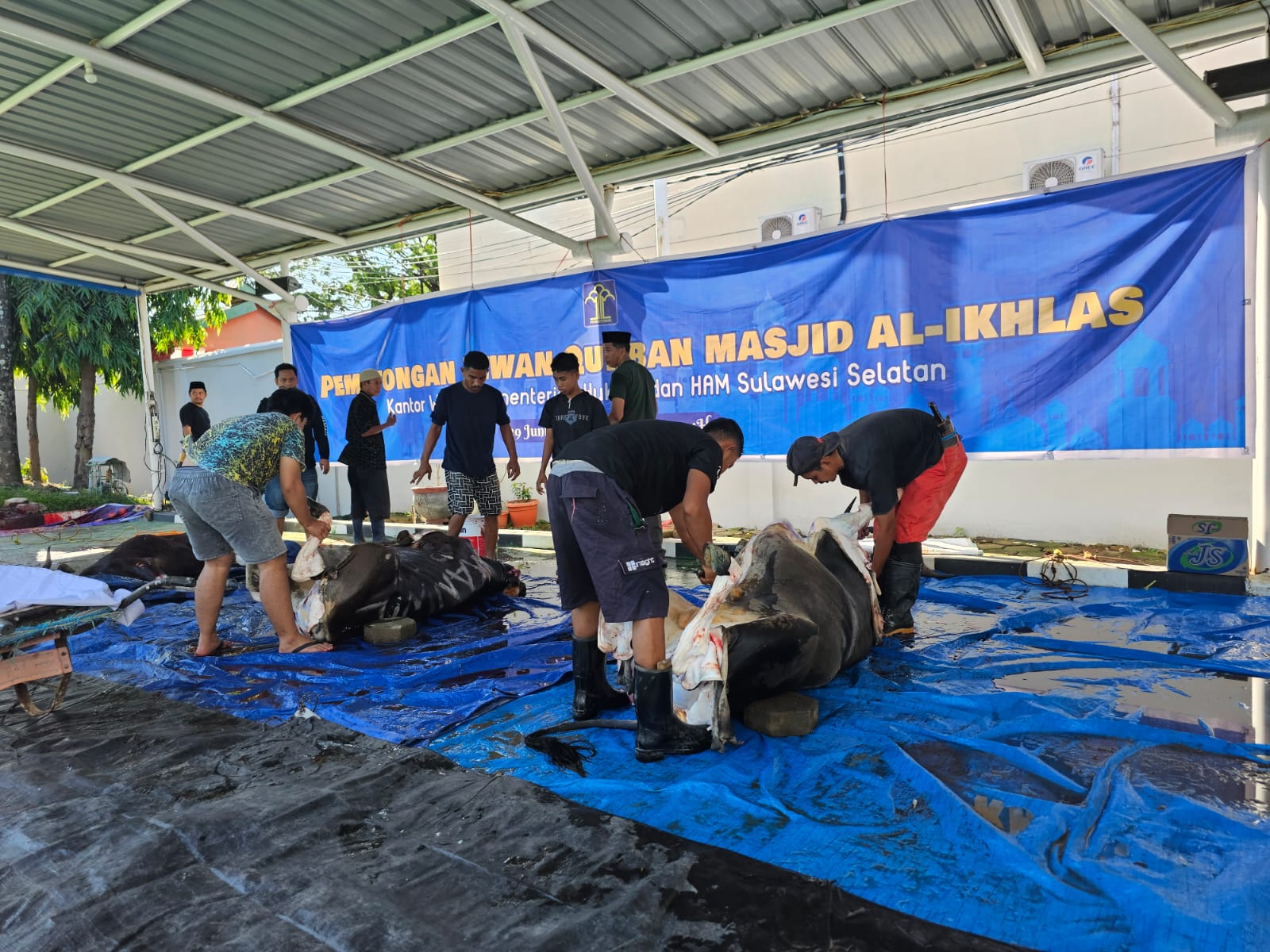 “Ibadah kurban lebih mendekatkan diri kita kepada Allah SWT. Selain itu juga sebagai ajang berbagi pada sesama yang ada di sekitar Kanwil Kemenkumham Sulsel,” kata Liberti di sela-sela menyaksikan langsung prosesi pemotongan hewan kurban, di Pelataran Kanwil Kemenkumham Sulsel, Kamis (29/06/2023).