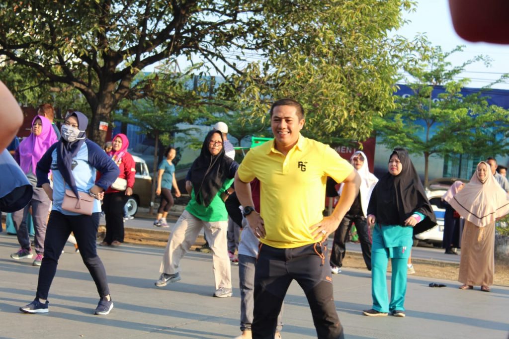 Politisi Golkar ini pun terlihat antusias dan happy mengikuti setiap gerakan yang dipandu oleh tiga orang instruktur senam.