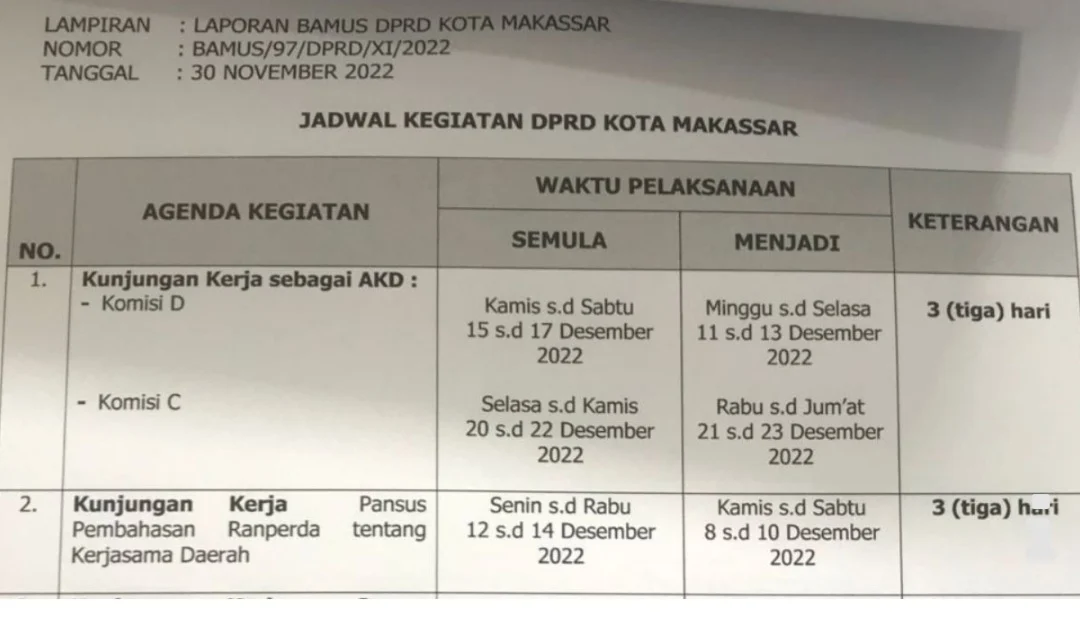 Dilansir dari website resmi DPRD Makassar, Senin (5/12/2022), berikut agenda DPRD Makassar selama Desember 2022. Dimulai dari kunjungan kerja AKD Komisi C pada 11-13 Desember 2022 dan Komisi D pada 21-23 Desember 2022, kunjungan kerja Pansus Pembahasan Ranperda tentang Kerjasama Daerah pada 8-10 Desember 2022, serta kunjungan kerja Pansus Pembahasan Ranperda tentang Pengelolaan Lahan Pangan Pertanian Berkelanjutan pada 11-13 Desember 2022.