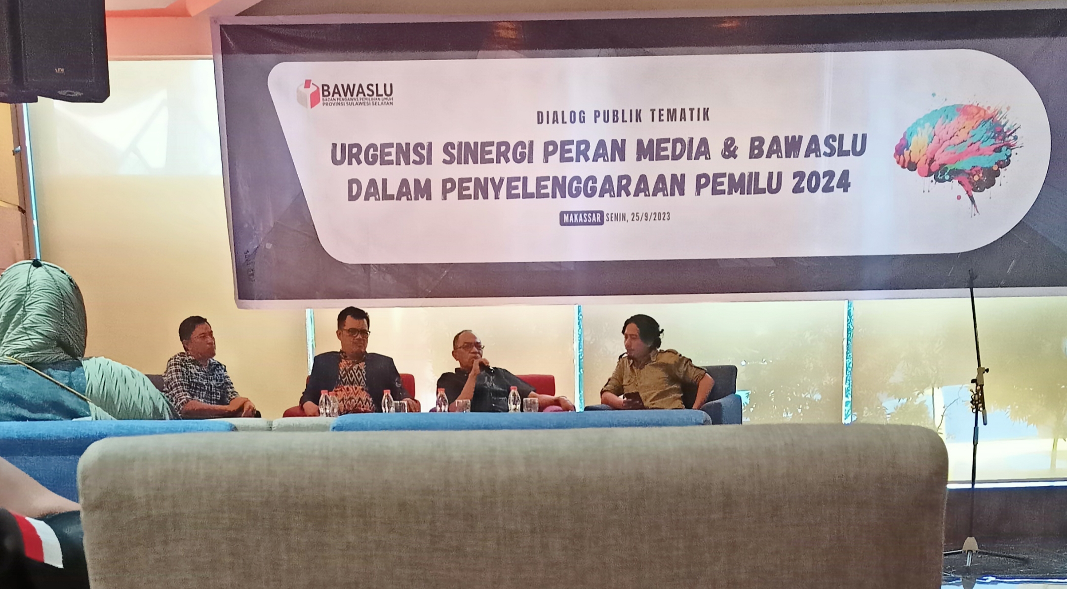 Dialog publik ini mengangkat tema “Urgensi Sinergi Peran Media dan Bawaslu dalam Penyelenggaraan Pemilu 2024“. Hadir Ketua Bawaslu Sulsel Mardiana Rusli, Komisoner Bawaslu Sulsel Divisi Humas dan Data Informasi Alamsyah, mantan Ketua Bawaslu Sulsel Periode 2018-2023 Laode Arumahi, serta Pemimpin Redaksi Harian Fajar, Amrullah Basri Gani.
