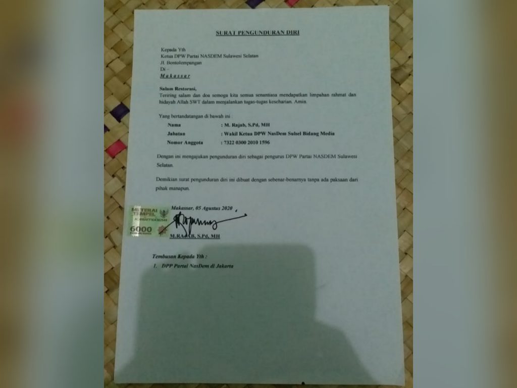 Surat pengunduran diri Rajab, ternyata sudah diteken sejak 5 Agustus 2020 lalu, diatas matetai 6000. Rajab mengakui jika dirinya memang sebagai ketua tim pemenangan Akas.