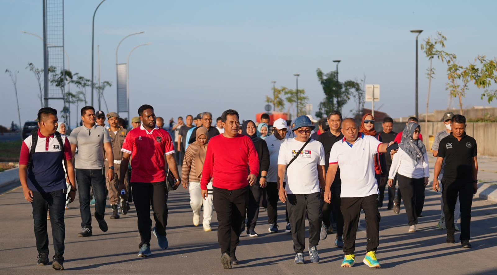 Kini, Bahtiar yang menjabat Pj. Gubernur Sulsel, memboyong anak buahnya untuk pertama kalinya jalan pagi di kawasan CPI Tanjung Bunga.