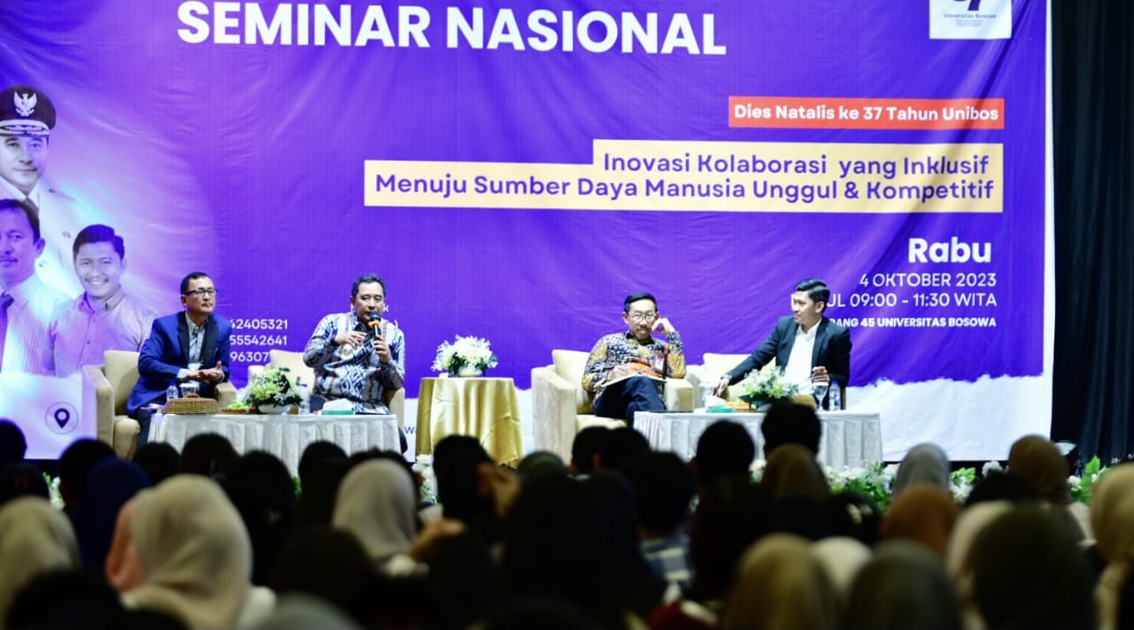 REPUBLIKNEWS.CO.ID, MAKASSAR — Pj Gubernur Sulsel Bahtiar Baharuddin, memberikan motivasi pada 400 mahasiswa Universitas Bosowa (Unibos) pada seminar nasional yang mengangkat tema Inovasi Kolaborasi yang Inklusif Menuju Sumber Daya Manusia Unggul dan Kompetitif, Rabu (04/10/2023).