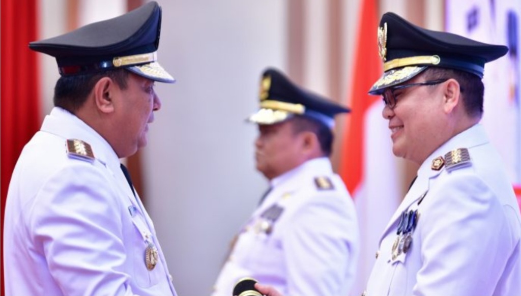 Rangkaian proses pelantikan, setelah pembacaan SK dan pengambilan sumpah jabatan, dilanjutkan penandatangan berita acara/fakta integritas, kemudian pemasangan tanda pangkat jabatan dan penyerahan SK Mendagri.