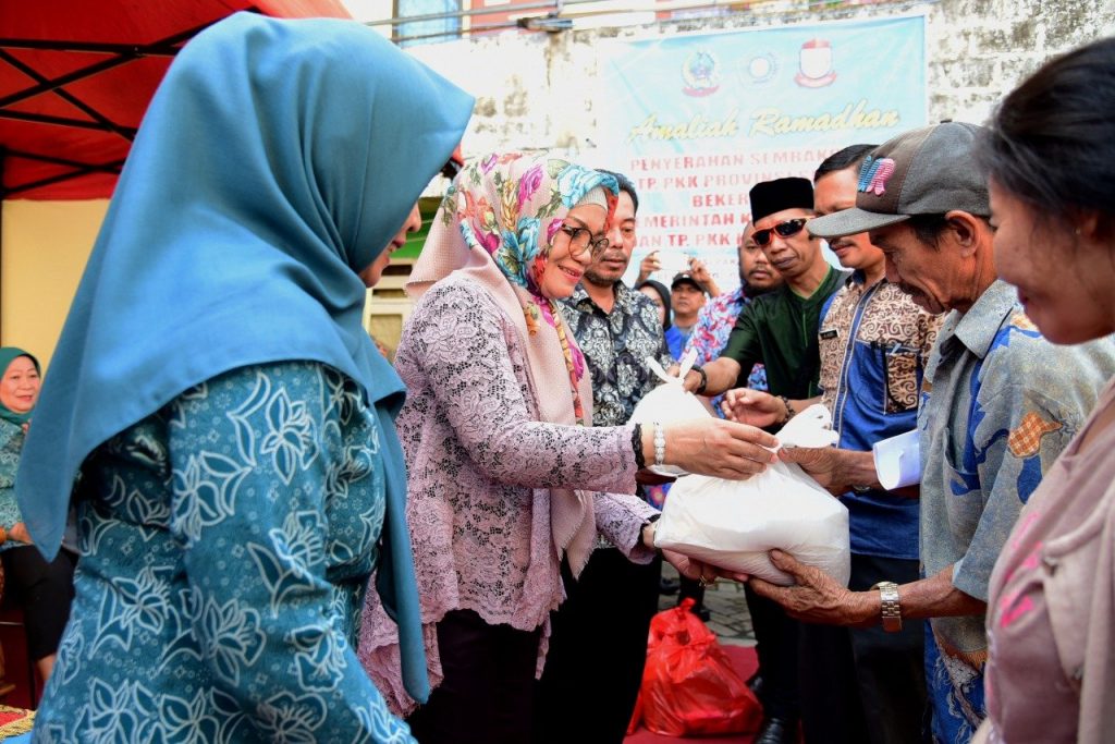 TP PKK Sulsel bekerja sama dengan TP PKK Kota Makassar pada acara pembagian paket paket sembako gratis kepada ratusan warga Mariso ini. (rls)