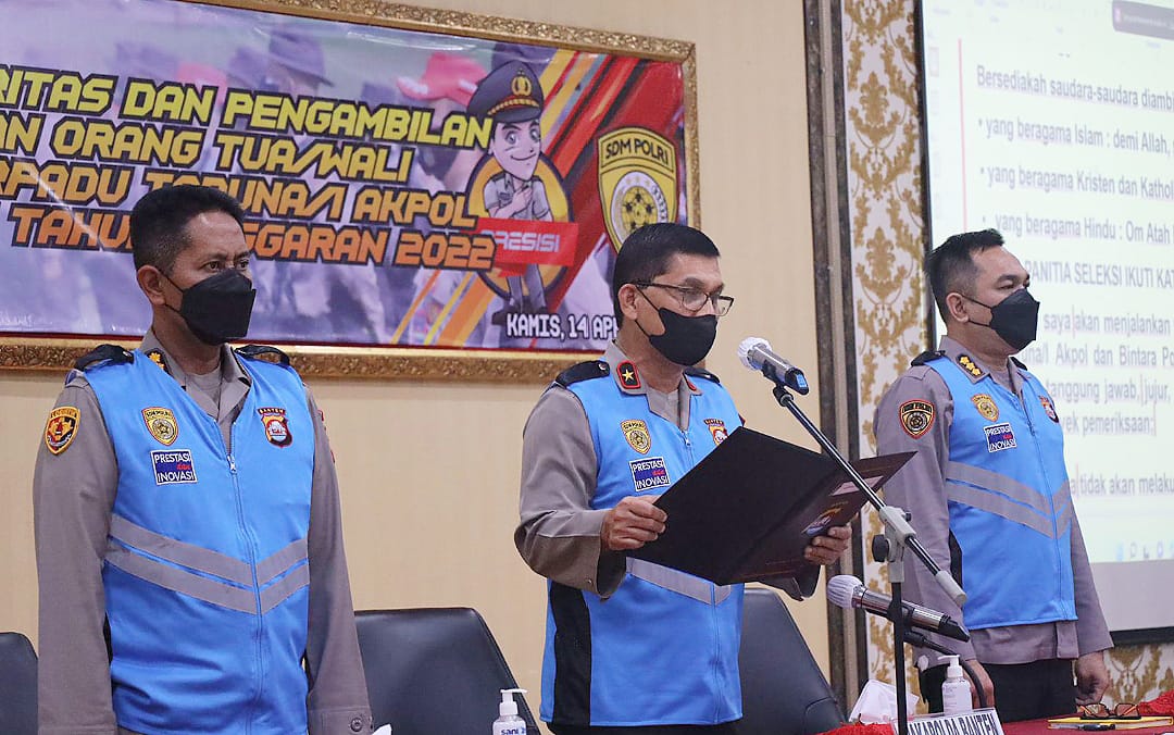 REPUBLIKNEWS.CO.ID, SERANG – Polda Banten melaksanakan kegiatan pengambilan sumpah dan penandatanganan Pakta Integritas dalam seleksi penerimaan terpadu Taruna/i Akpol dan Bintara Polri gelombang 2 Tahun 2022 di Aula Serbaguna Polda Banten pada Kamis (14/04/2022).