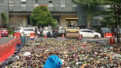 Ribuan botol miras yang diamankan polisi kemudian dimusnahkan di Lapangan depan Gedung Direktorat Kriminal Khusus Polda Metro Jaya dengan menggunakan alat berat roller.