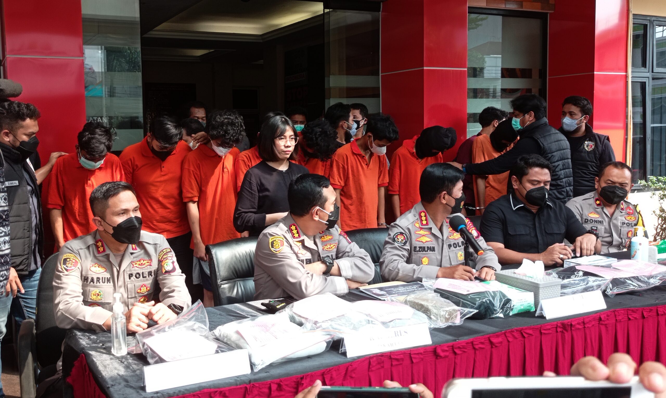 Kesembilan tersangka dihadirkan dalam konferensi pers di halaman Mapolres Metro Jakarta Selatan, Jalan Wijaya II, Kebayoran Baru, Jaksel. Sebagian wajah para pelaku tampak tertutup sebo.