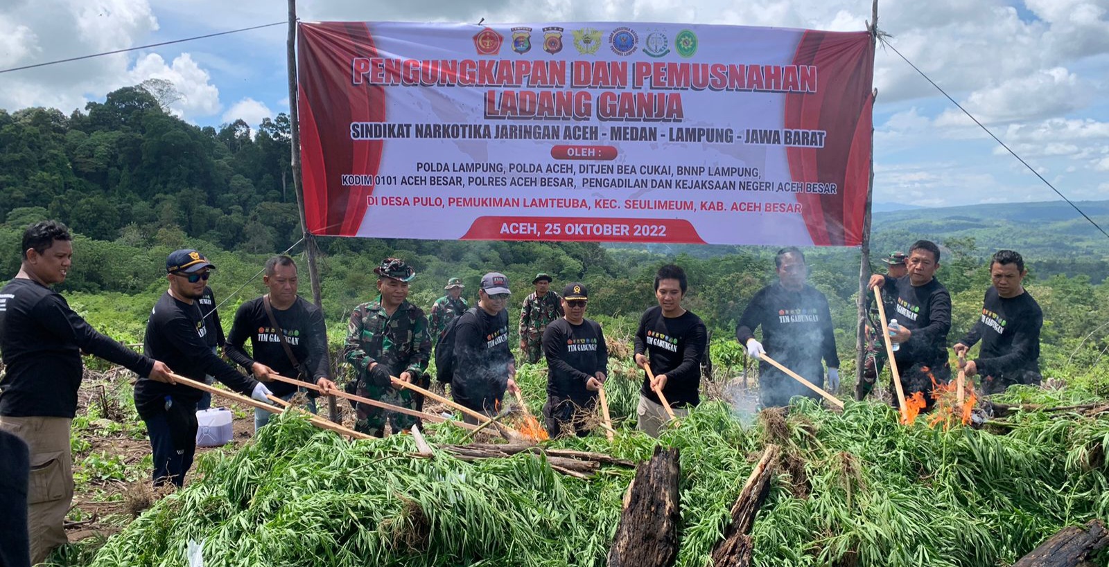 “Selasa tanggal 25 Oktober 2022 sekitar pukul 11.00 WIB, Tim Terpadu telah melaksanakan kegiatan pemusnahan ladang ganja seluas 2 hektar dengan berat kurang lebih 12 ton,” jelas Aris.
