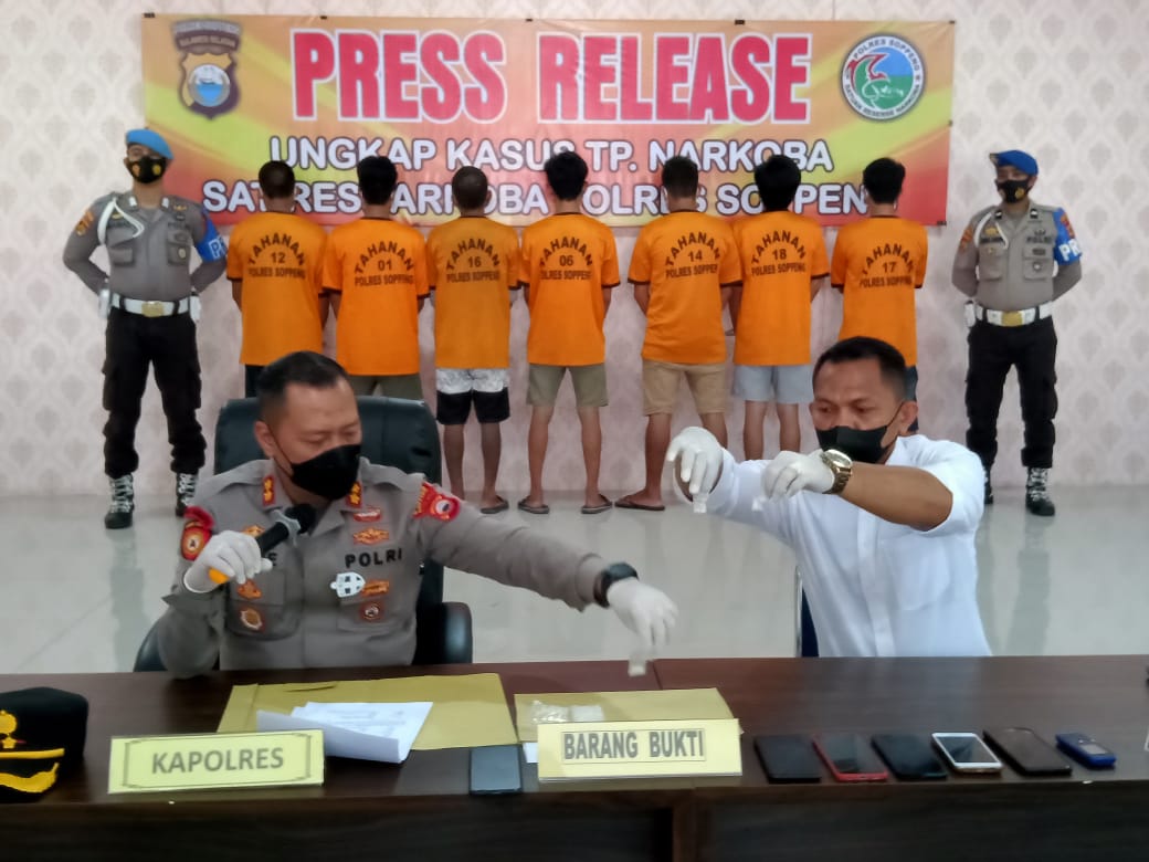 Konferensi pers yang dipimpin Kapolres Soppeng AKBP Santiaji Kartasasmita yang didampingi oleh Kasat Narkoba Polres Soppeng AKP La Ode dalam mengungkap dugaan pelaku penyalahgunaan Narkotika jenis sabu-sabu di Wilayah Hukum Polres Soppeng.