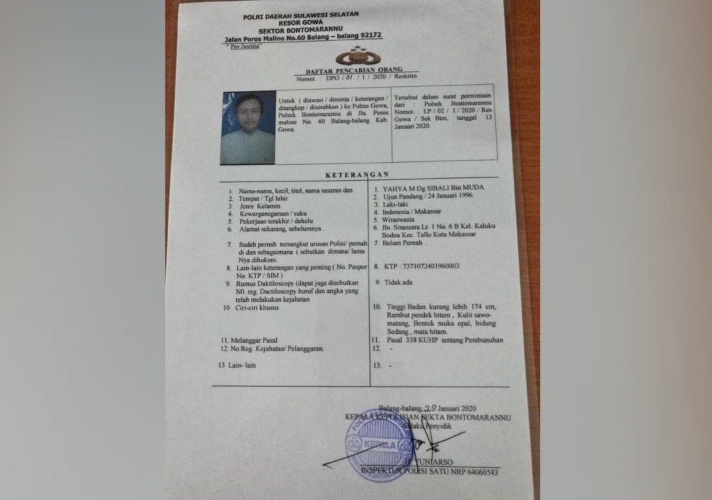 Atas beberapa keterangan kemudian penyidik melakukan pencarian terhadap suami korban yang hingga saat ini belum ditemukan selanjutnya, Penyidik resmi mengeluarkan daftar pencarian orang (DPO) No. 01/01/2020/ Reskrim, tanggal 29 Januari 2020 terhadap Yahya M.Dg Sibali, (25), dengan ciri ciri tinggi badan 174 Cm, Rambut pendek hitam, kulit sawo matang muka Oval yang merupakan suami korban.