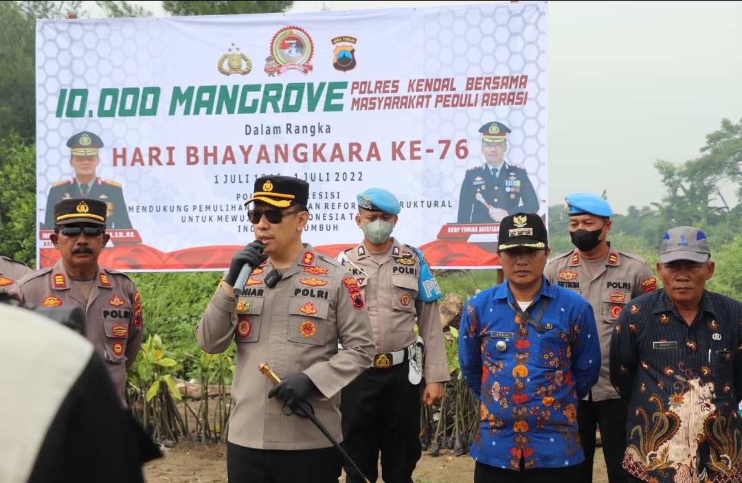 Kapolres Kendal bersama undangan yang hadir dan personel, melakukan penanaman pohon bakau sebanyak 10 ribu pohon mangrove sebagai bentuk kepedulian Polri, dengan harapan banyaknya penanaman pohon mangrove yang dilakukan sekarang, maka akan menjaga agar pantai tidak rusak dari hantaman gelombang laut dan antisipasi abrasi di bibir pantai Utara Kecamatan Kangkung.