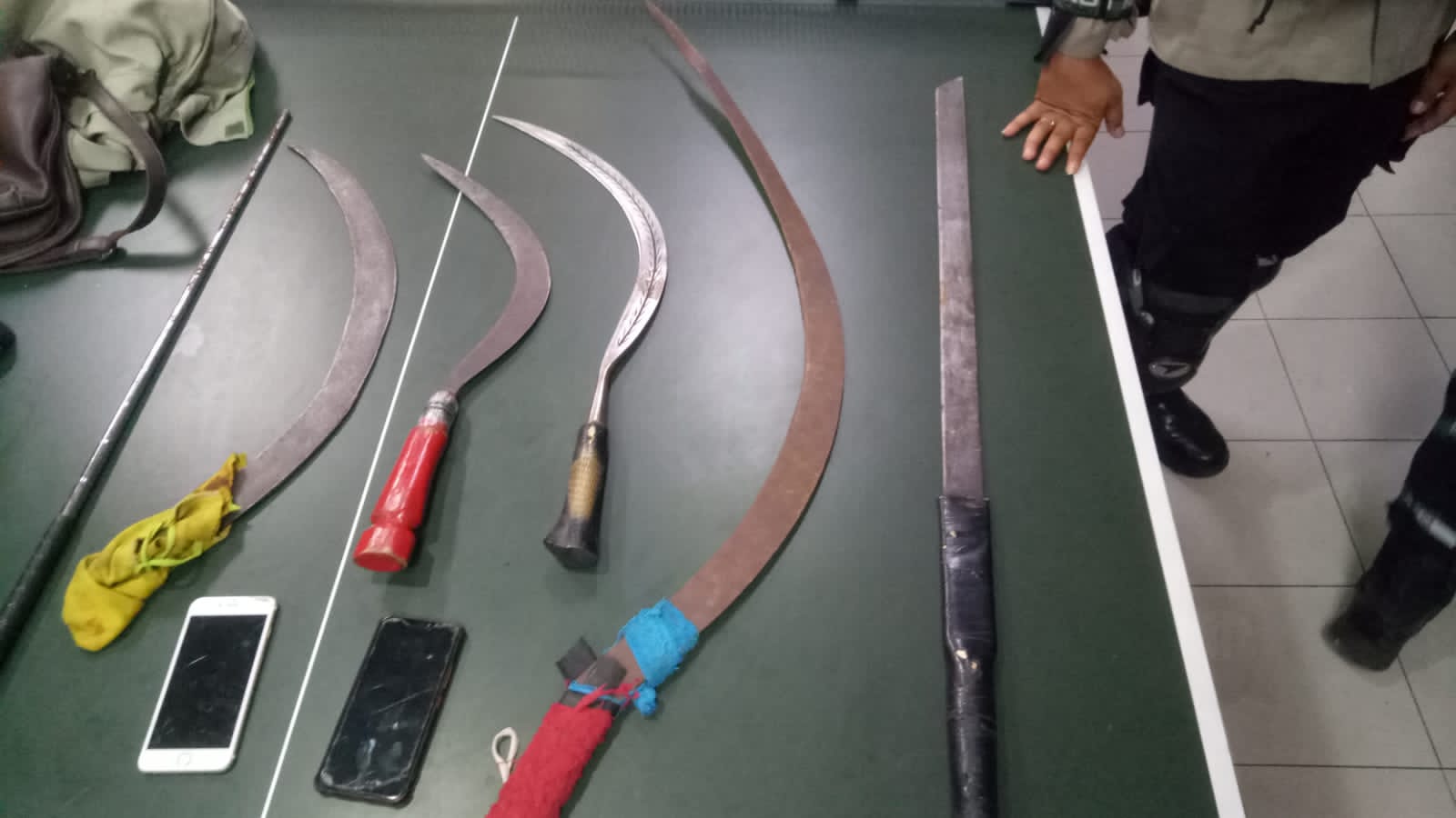 “5 orang pemuda berhasil kami amankan berikut berbagai senjata tajam diantaranya 4 buah senjata tajam jenis celurit, 1 buah samurai,” kata Rahmad.