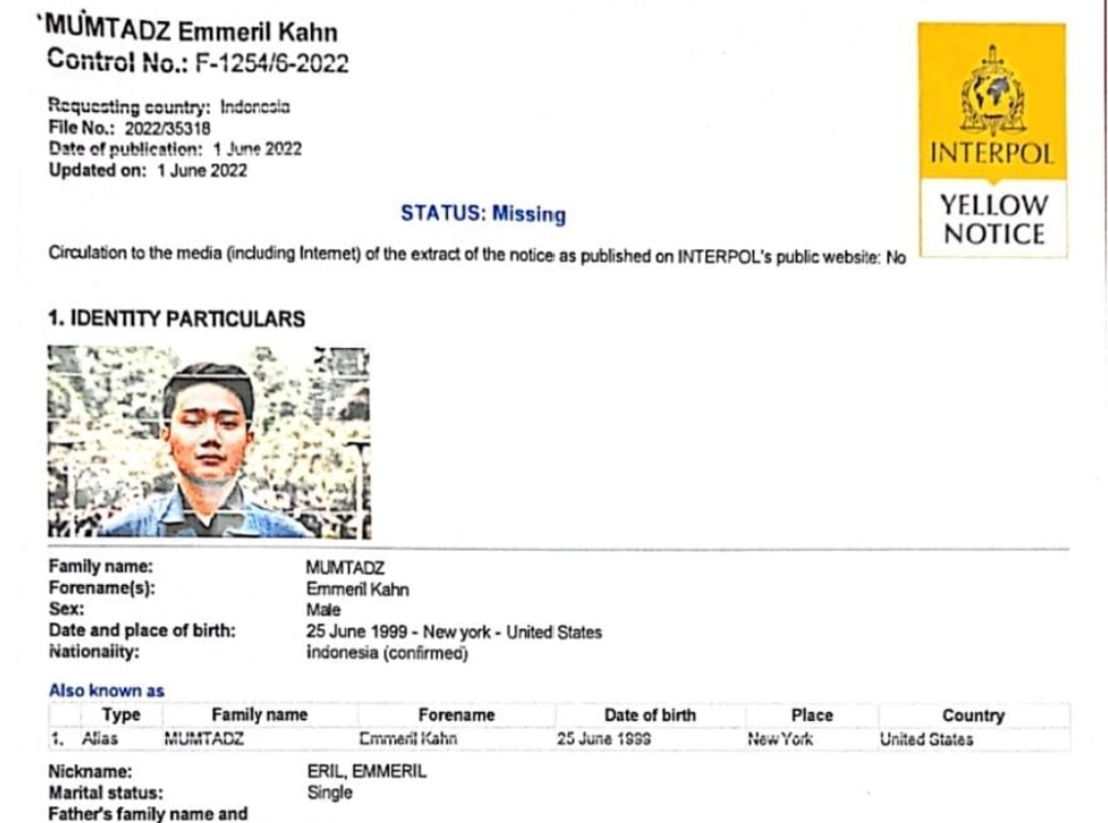 “Ya betul, Interpol sudah merilis Yellow Notice Eril,” kata Kepala Divisi Humas Polri Irjen Dedi Prasetyo kepada wartawan, Jakarta, Kamis (02/06/2022).