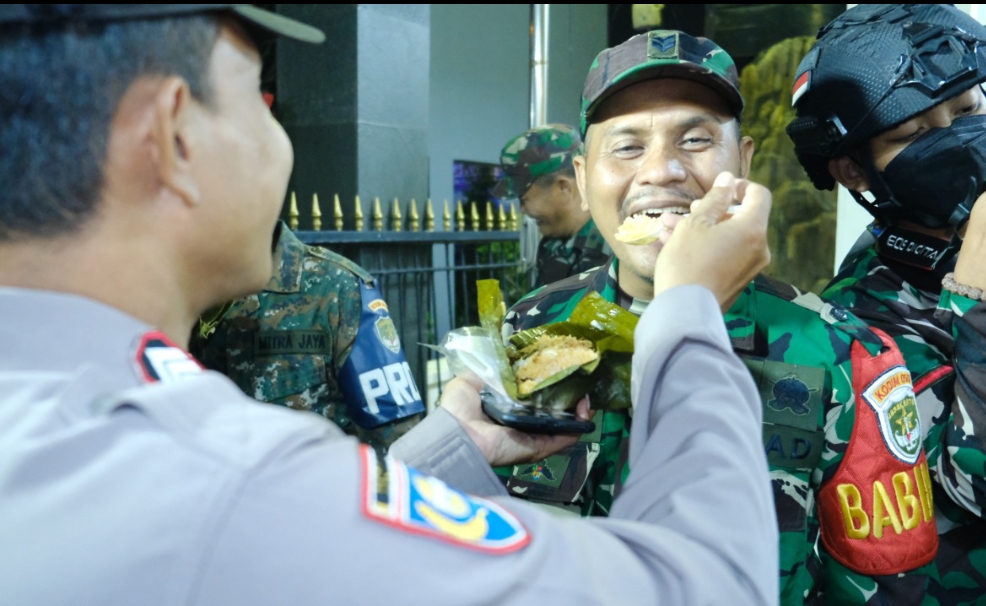 Danramil 04 Cengkareng Kapten Inf Kurniawan dan Camat Cengkareng Ahmad Faqih membawa tumpeng untuk anggota Polsek Cengkareng.
