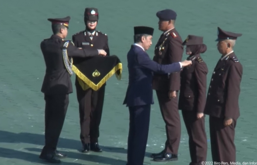 “Menimbang dan seterusnya, mengingat dan seterusnya, memutuskan, menetapkan dan seterusnya. Kesatu, menganugerahkan tanda kehormatan Bintang Bhayangkara Nararya kepada mereka yang nama pangkat dan jabatannya tersebut dalam lampiran keputusan ini sebagai penghargaan kepada anggota Polri yang berjasa besar dengan keberanian, kebijaksanaan, dan ketabahan luar biasa melampaui panggilan kewajiban yang disumbangkan untuk kemajuan dan pengembangan kepolisian atau tidak pernah cacat selama bertugas di kepolisian,” ungkap Sekretaris Militer Presiden, Marsda TNI M Tonny Harjono.