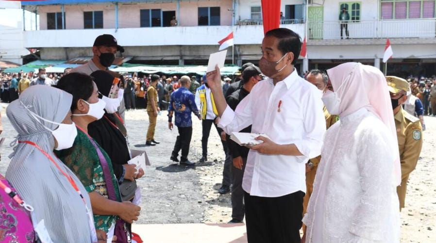 REPUBLIKNEWS.CO.ID, BENGKAYANG – Presiden Joko Widodo didampingi Ibu Iriana Joko Widodo menyerahkan Bantuan Modal Kerja (BMK) dan Bantuan Langsung Tunai (BLT) minyak goreng kepada peserta Program Keluarga Harapan (PKH) di Pasar Sungai Duri, Kabupaten Bengkayang, Provinsi Kalimantan Barat, Selasa, (09/08/2022).