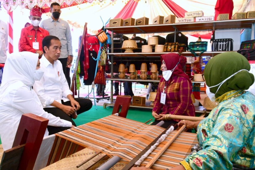 Usai menghadiri dan membuka Pertemuan Puncak Gugus Tugas Reforma Agraria (GTRA) Summit 2022 di Kabupaten Wakatobi, pada Kamis, 9 Juni 2022, Presiden Joko Widodo dan Ibu Iriana Joko Widodo mengunjungi sejumlah stan usaha mikro, kecil, dan menengah (UMKM) yang digelar tidak jauh dari lokasi acara.
