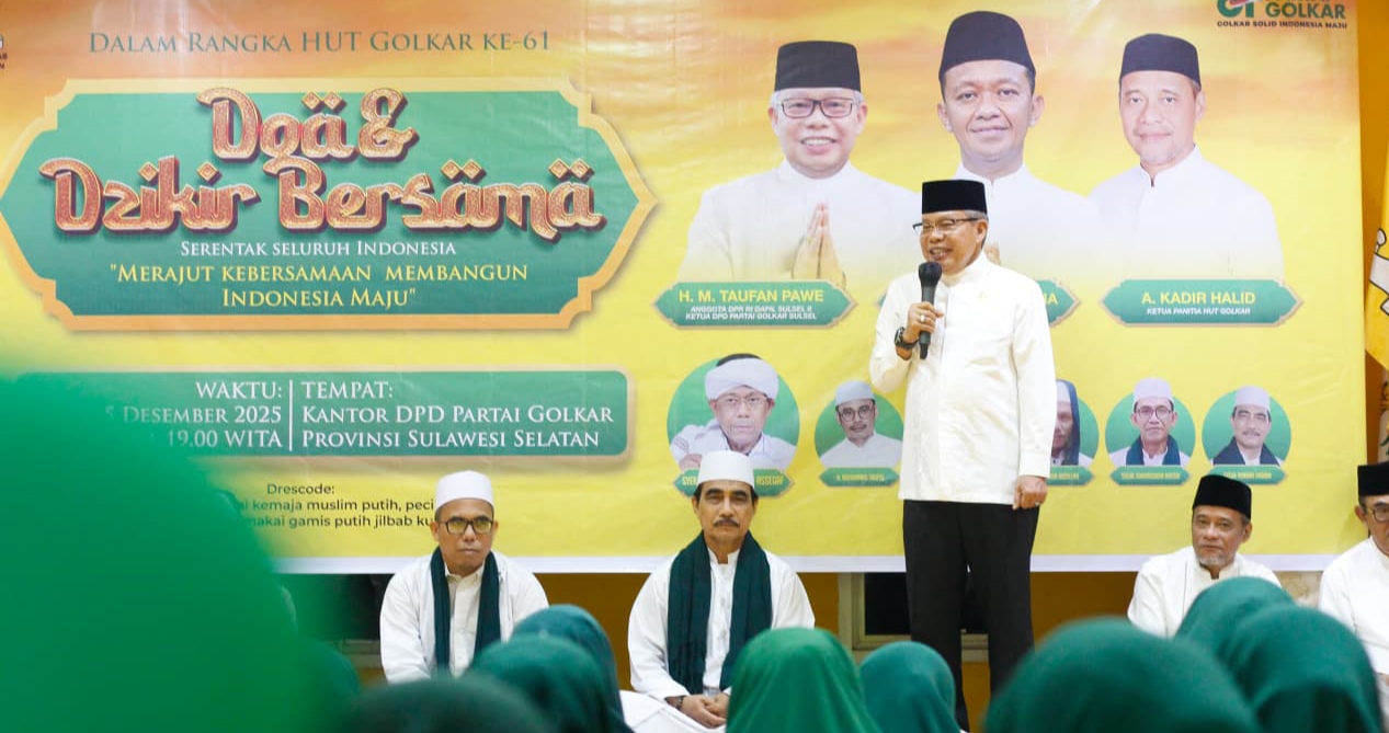 REPUBLIKNEWS.CO.ID, MAKASSAR – Ketua DPD I Partai Golkar Sulawesi Selatan, Taufan Pawe, memimpin doa dan zikir bersama untuk para korban bencana alam di Sumatera dan Aceh dalam acara puncak HUT ke-61 Partai Golkar yang digelar di Kantor DPD I Golkar Sulsel, Jalan Botolempangan, Makassar, Jumat (5/12/2025).