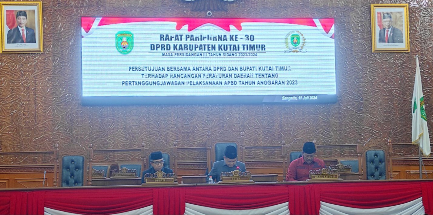 REPUBLIKNEWS.CO.ID, KUTAI TIMUR — Dewan Perwakilan Rakyat Daerah (DPRD) Kabupaten Kutai Timur (Kutim) menggelar Rapat Paripurna ke-30 tentang persetujuan bersama DPRD dan Bupati Kutim terhadap Rancangan Peraturann Daerah (Raperda) Pertanggungjawaban pelaksanaan APBD Kutim Tahun Anggaran (TA) 2023 di Ruang Sidang Utama DPRD Kutim, Kompleks Perkantoran Bukit Pelangi, Sangatta Utara, Kamis (11/07/2024) malam.