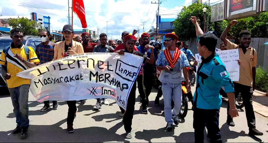 Aksi unjuk rasa menuntut pemulihan jaringan internet yang mengalami gangguan yang dampaknya dirasakan oleh seluruh warga Merauke. Erornya akses internet tersebut sudah berlangsung selama sebulan lebih.