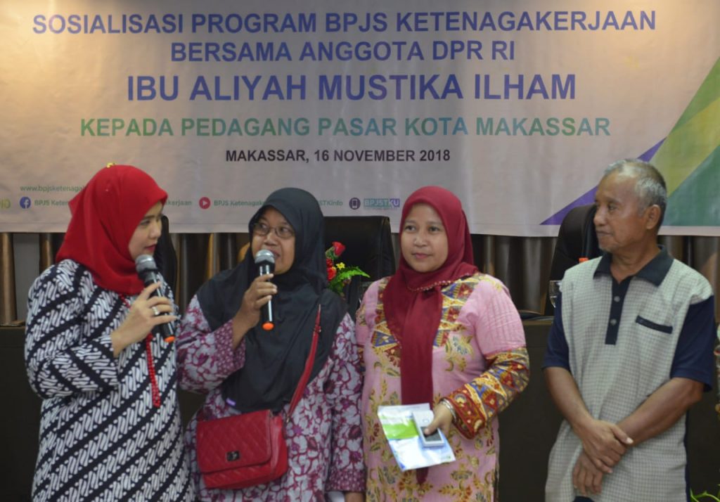 REPUBLIKNEWS.CO.ID, MAKASSAR — Badan Penyelenggara Jaminan Sosial (BPJS) menggelar sosialisasi program BPJS Ketenagakerjaan bersama Anggota DPR RI, Aliyah Mustika Ilham yang diikuti pedagang pasar tradisional, di Ballroom Hotel Ramayana Makassar, Jumat (16/11/2018).
