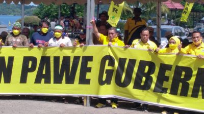 Para nelayan kompak dan semangat membentangkan spanduk lalu meneriakkan yel yel “Taufan Pawe Gubernur. Airlangga Presiden”.
