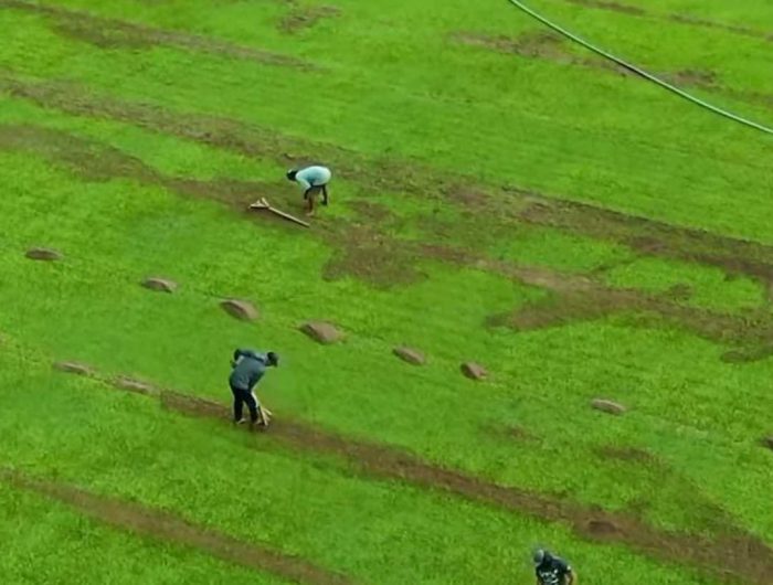 “Alhamdulillah, pengerjaan drainase lapangan hampir rampung. Sisa pembenahan, perawatan hingga penyegaran rumput lapangan,” ucap Taufan.