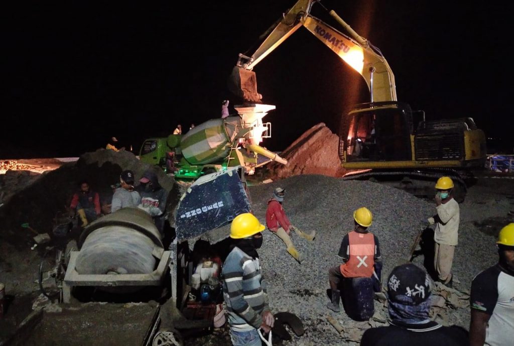 Dari pantauan republinews.co.id, sejumlah para pekerja melakukan pengecoran di lantai dua pembangunan Rest Area Jenponto di malam hari, Jumat (25/09/2020).