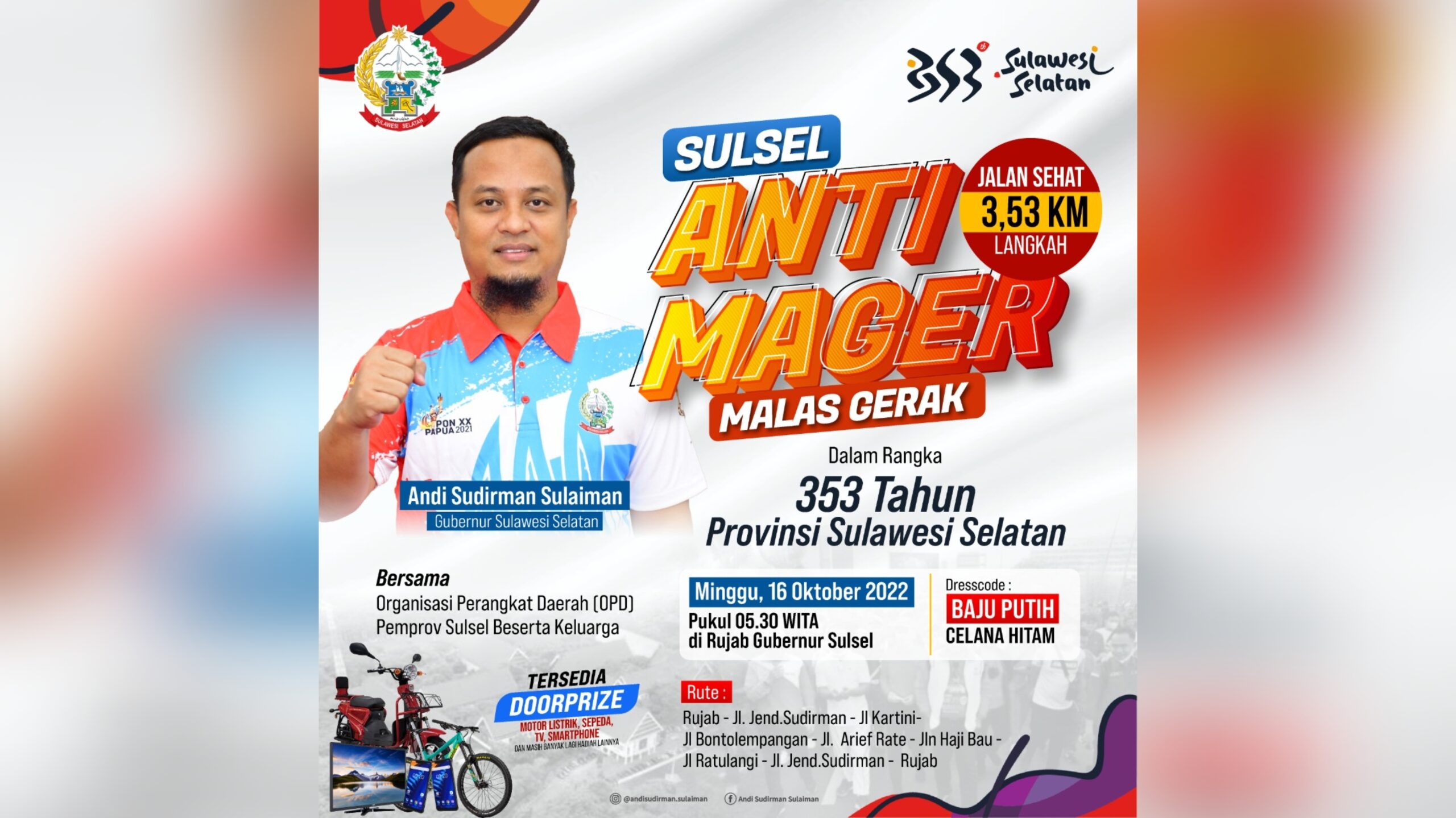 Plh Sekda Provinsi Sulsel, Andi Darmawan Bintang menjelaskan, program Anti Mager sebenarnya menjadi program Pemprov Sulsel sebagai dorongan bagi Aparatur Sipil Negara (ASN) dan masyarakat secara luas untuk gemar berolahraga. Pada pelaksanaannya gratis, atau tidak dipungut biaya apapun.