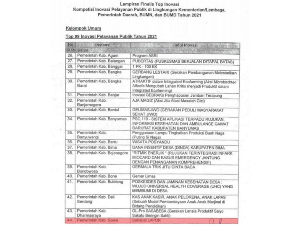 REPUBLIKNEWS.CO.ID, GOWA — Inovasi pelayanan publik yang digagas Pemerintah Kabupaten Gowa. Salah satunya Sahabat Lapor masuk dalam Finalis Top 99 Inovasi Pelayanan Publik Tahun 2021 yang dilaksanakan Kementrian Pendayagunaan Aparatur Negara dan Reformasi Birokrasi (KEMENPANRB).