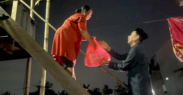 Ditemani tokoh masyarakat setempat, Rudianto Lallo keliling dibonceng motor menyusuri lorong-lorong, hingga masuk berjalan kaki dijalan berlumpur untuk membangunkan warga sahur sekaligus membagikan makanan siap santap.