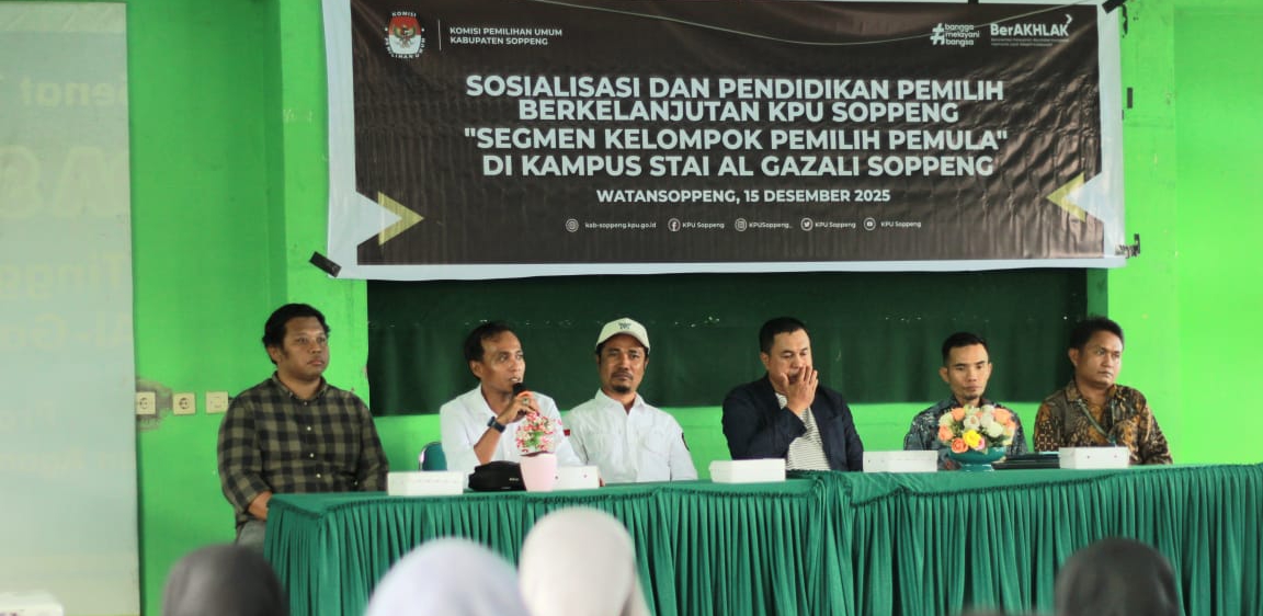Terbaru, KPU Soppeng sukses menggelar kegiatan Sosialisasi dan Pendidikan Pemilih Berkelanjutan Tahun 2025 yang secara spesifik menargetkan mahasiswa dan mahasiswi Sekolah Tinggi Agama Islam (STAI) Al Gazali Soppeng, Senin (15/12/2025).