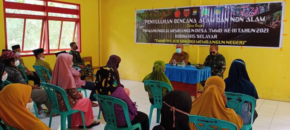 REPUBLIKNEWS.CO.ID, KEPULAUAN SELAYAR — Penyuluhan Bencana Alam dan Non Alam dalam rangka TNI Manunggal Membangun Desa (TMMD) ke 111 Tahun 2021 Kodim 1415/Selayar, berlangsung di UPT SD Negeri 5 Kepulauan Selayar, Dusun Bitombang, Kelurahan Bontobangun, Kecamatan Bontoharu, Kabupaten Kepulauan Selayar, Senin (26/06/2021).