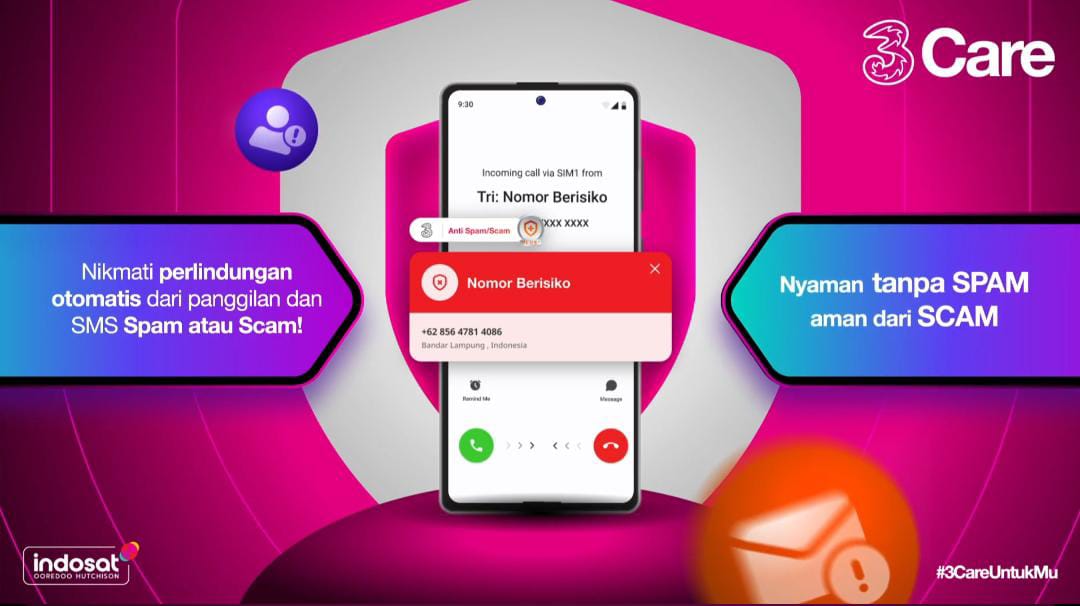 Fitur SATSPAM juga dihadirkan bagi pelanggan Tri (3). Fotur ini akan memberikan perlindungan otomatis terhadap panggilan dan SMS yang bersifat spam dan scam. (Dok. Istimewa)