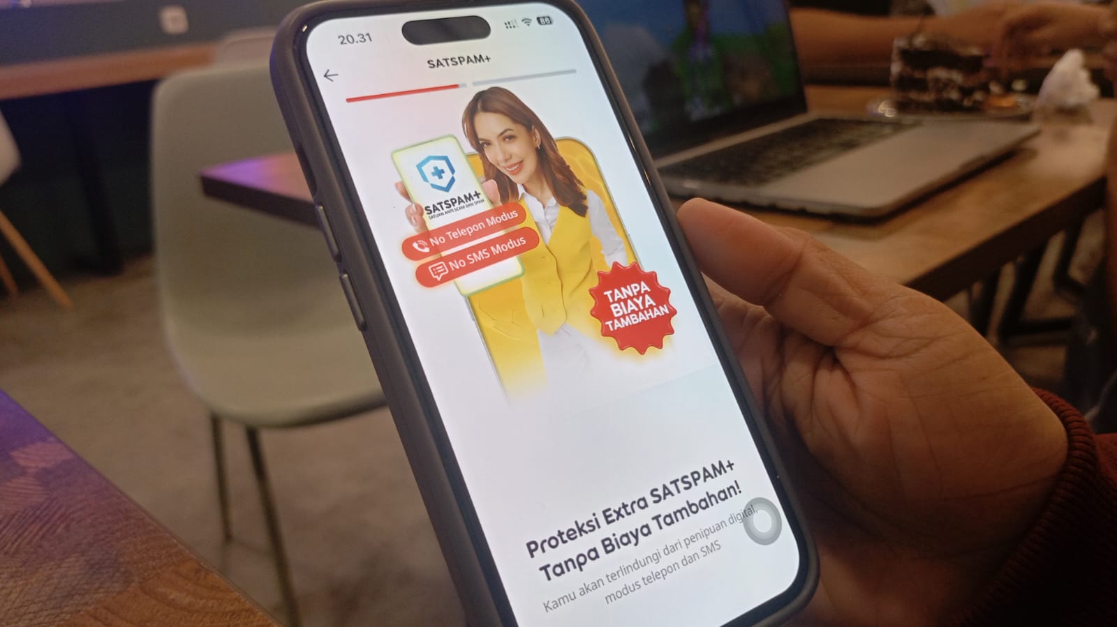 Pengguna IM3 saat memperlihatkan fitur SATSPAM di aplikasi MyIM3 miliknya. Inovasi yang dirancang Indosat ini adalah upaya melindungi konsumen dari penipuan digital. (Dok. Chaerani/Republiknews.co.id)