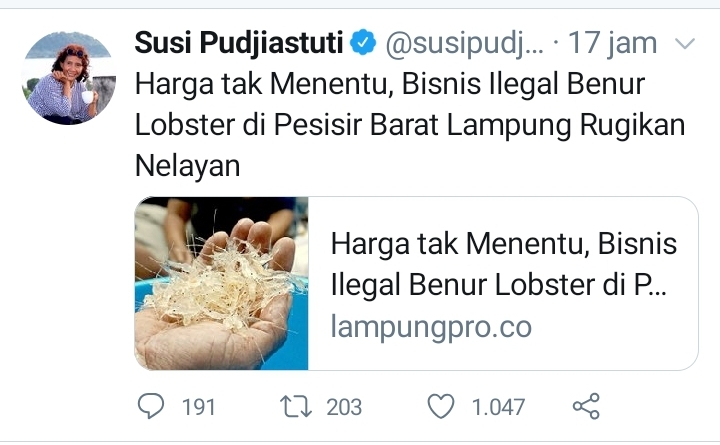 “Harga tak Menentu, Bisnis Ilegal Benur Lobster di Pesisir Barat Lampung Rugikan Nelayan,” tulis Susi dalam akun Tweeternya, Selasa (24/11/2020).